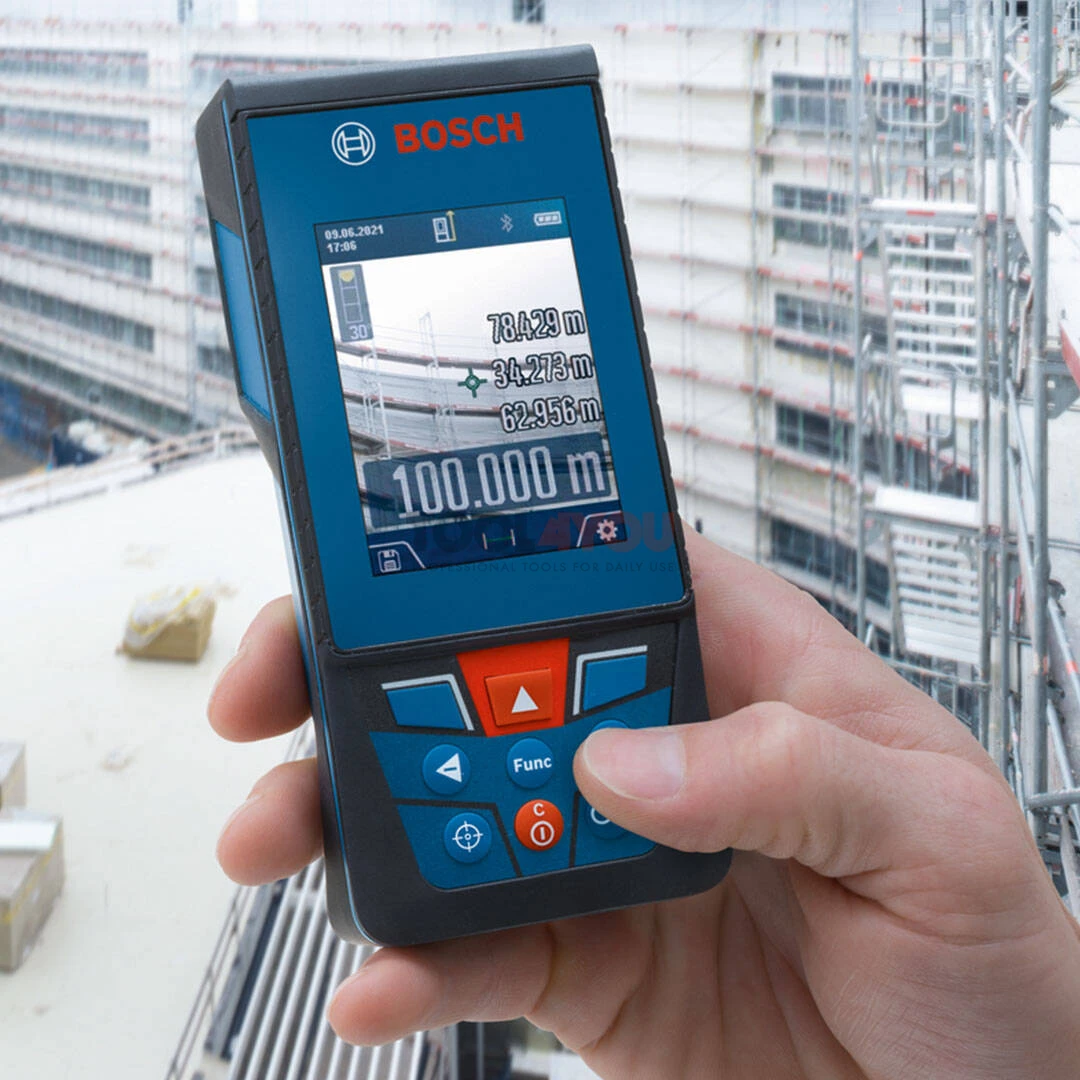 Dalmierz laserowy Bosch GLM 100-25 C to profesjonalne narzędzie pomiarowe, które umożliwi szybkie wykonywanie precyzyjnych pomiarów zarówno w pomieszczeniach jak i na zewnątrz. Posiada duży kolorowy wyświetlacz IPS o wysokim kontraście z funkcją zmiany orientacji obrazu oraz kamerę z funkcją przybliżania. Dzięki klasie ochrony IP54 i wyświetlaczowi odpornemu na zarysowania poradzi sobie w trudnych warunkach roboczych. Wyposażony w gwint 1/4" może być mocowany na statywie. Dalmierz jest zasilany bateriami AA.