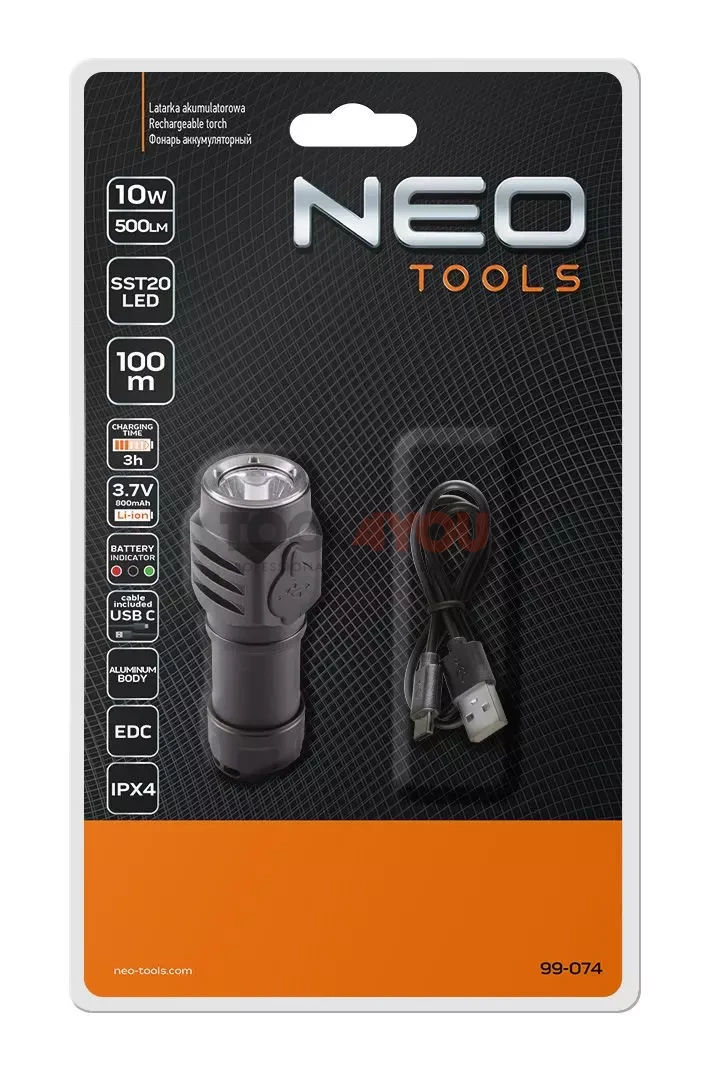 Akumulatorowa latarka o strumieniu świetlnym do 500 lm i mocy 10W. Wyposażona w akumulator litowo-jonowy 3,7 V 800 mAh. Posiada światła ledowe SST20, cechujące się wysoką odpornością na mechaniczne wstrząsy, zmiany temperatur czy wibracje.