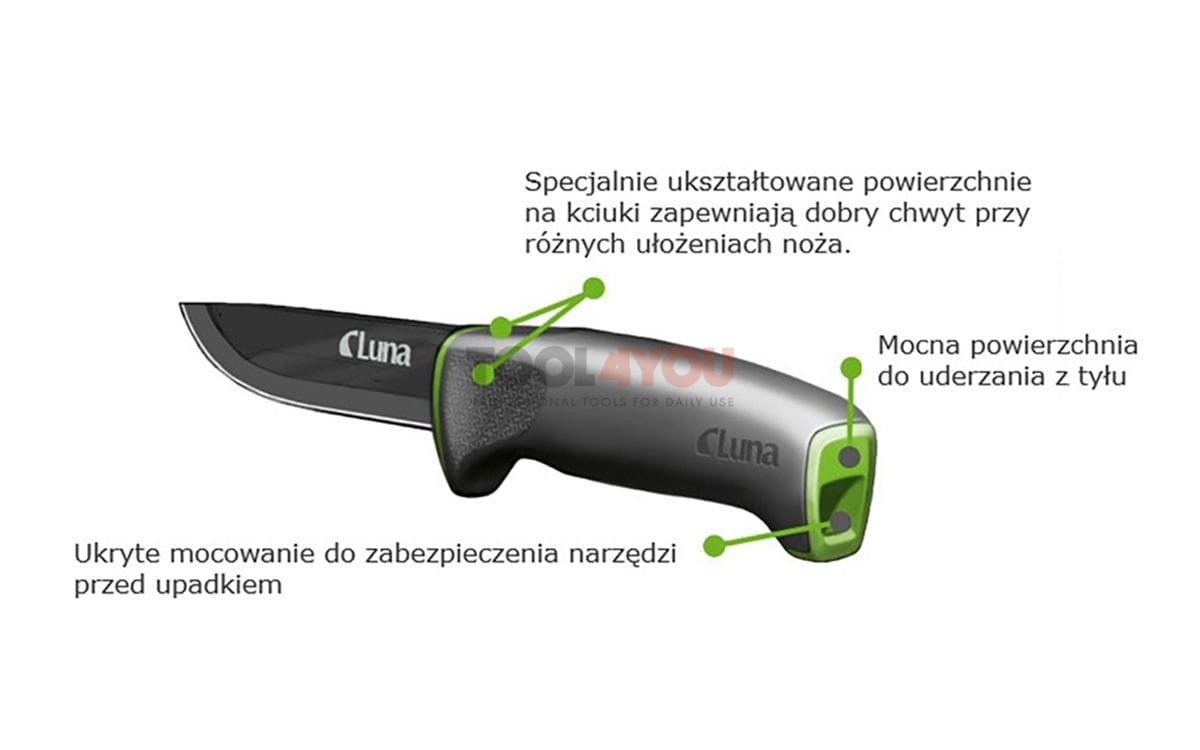 Nóż Luna Safety CS to niezawodne narzędzie stworzone z myślą o skandynawskich warunkach. Charakteryzuje się mocną rękojeścią, która została starannie dopasowana do kształtu dłoni, co zapewnia wygodny i stabilny chwyt. Innowacyjna ochrona palców na przedniej i tylnej krawędzi minimalizuje ryzyko wyślizgnięcia się noża podczas użytkowania, a specjalnie ukształtowany uchwyt na kciuk ułatwia precyzyjne manewrowanie oraz identyfikację pozycji na ostrzu.