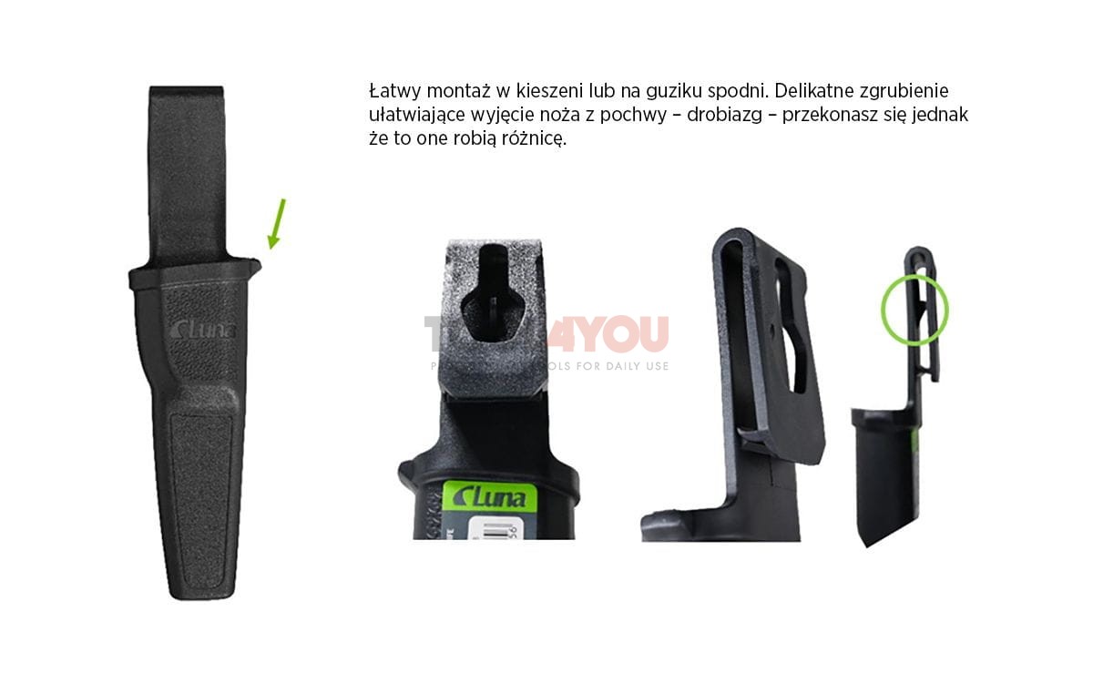 Pochwa noża Luna Safety CS wyposażona jest w praktyczny klips, który ułatwia przypięcie do pasa, zapewniając szybki i łatwy dostęp do narzędzia. Dzięki swojej konstrukcji oraz zastosowanym materiałom, nóż ten doskonale sprawdzi się w różnych warunkach oraz podczas różnorodnych działań na świeżym powietrzu, czyniąc go idealnym wyborem dla wszystkich miłośników przygód.