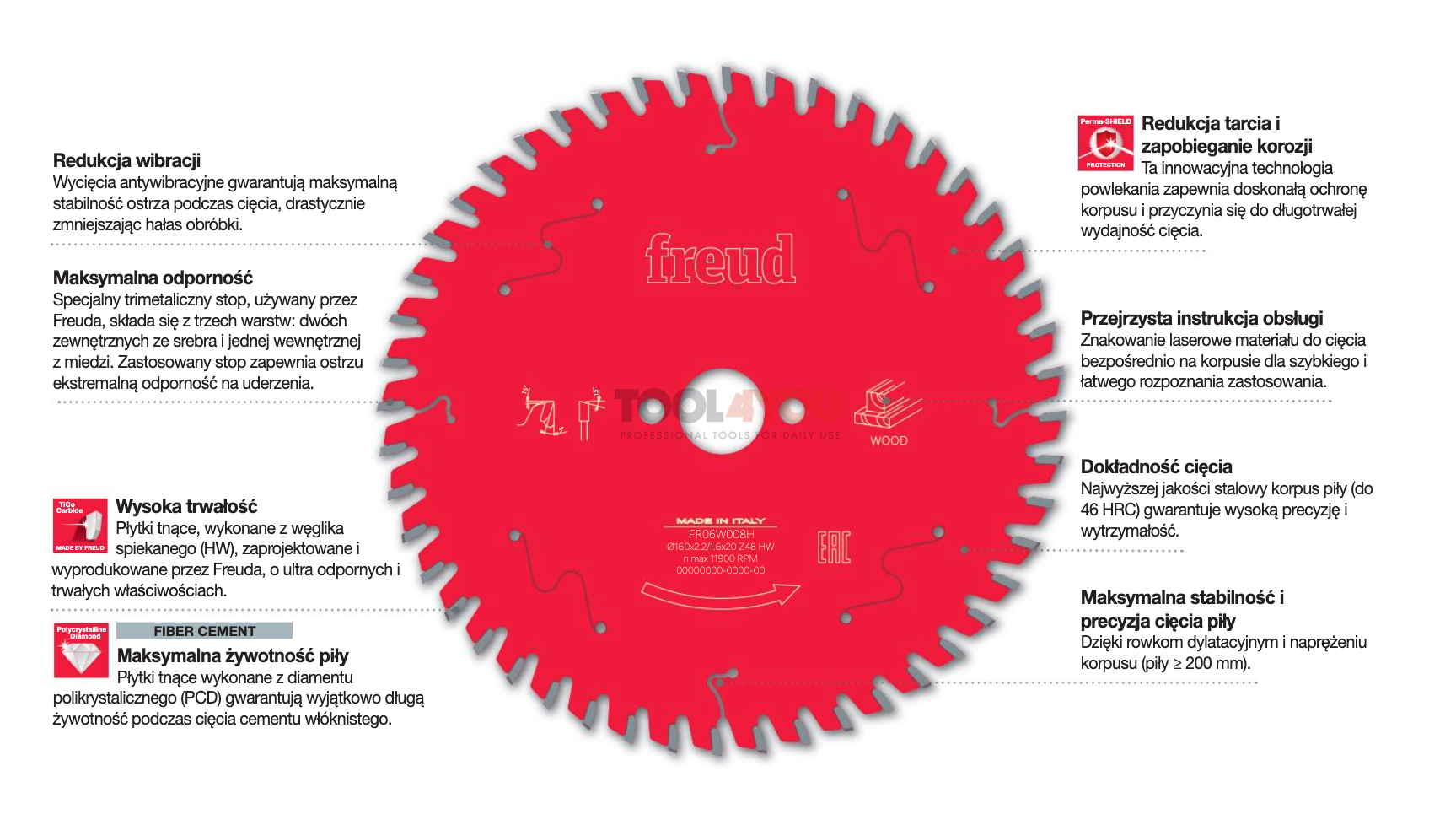 - Lutowane złącze Freud Tri-Metal dla zwiększonej stabilności przy obciążeniach