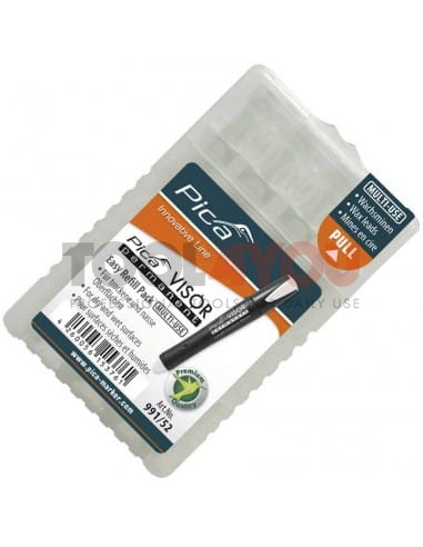 Pica Visor to niezbędny marker, który sprawdzi się we wszelkich pracach, gdzie trzeba zaznaczyć pomiary. Jest to wodoodporny woskowy wkład, który jest odpowiednikiem aż 5 markerów olejowych, dzięki czemu jest bardzo ekonomiczny. Opatentowany mechanizm ułatwia szybkie wymiany wkładów prosto z pudełka do znacznika. Wkład nigdy nie wysycha, dzięki czemu do samego końca można zużyć produkt.